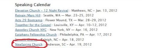 However if I were Perry Noble (the cussing pastor) would I want my mega church to hear the message of repentance and faith in Christ for the forgiveness of sins? Well he atleast has a couple of months to pull out with some excuse before Matt shows up. Matt Chandler’s speaking calender: