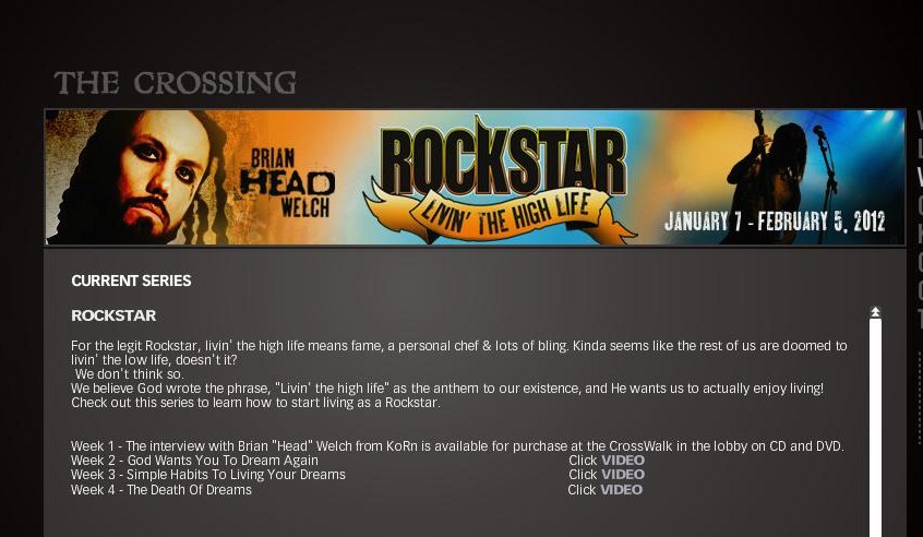 I would like to call The Crossing a church but I choke on the word. I think the pastor himself will agree with me it’s more of a social pass time group that meets on Sundays. Nothing on it’s website points to Christ. Not even it’s latest sermon series. (click photo to enlarge)